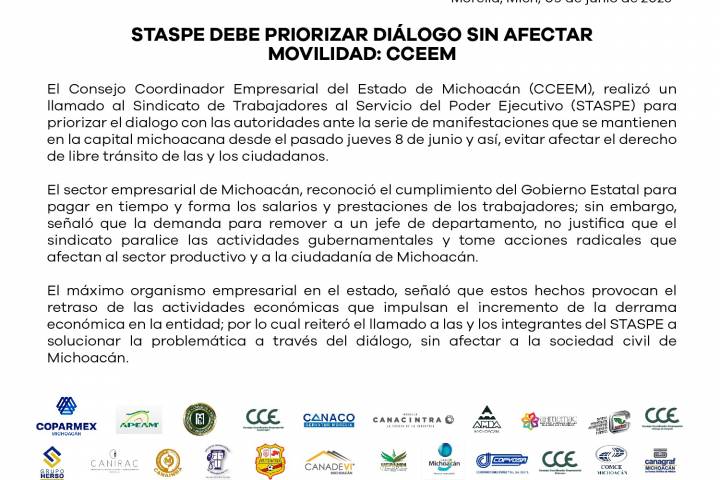 El Consejo Coordinador Empresarial del Estado de Michoacán (CCEEM), realizó un llamado al Sindicat...
