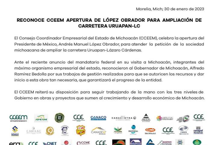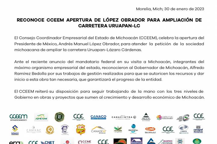 Reconoce CCEEM apertura de AMLO para ampliación de carretera Uruapan-LC