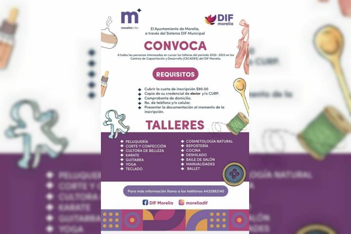 NOTICIAS 08/09/2022DIF Morelia, convoca a ciudadanía a inscribirse a los talleres 2022-2023Continuar brindando capacitación para el trabajo y emprendimiento a mujeres y hombres prioritariamente de zonas vulnerables del municipio de Morelia, es una premisa del gobierno municipal que encabeza el presidente Alfonso Martínez Alcázar y para la cual se trabaja con el fin de dar cabal cumplimiento a ello.
