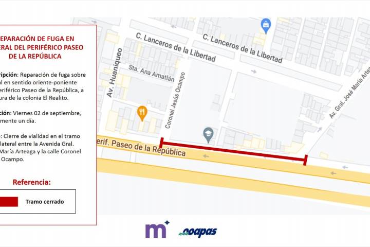 NOTICIAS 01/09/2022OOAPAS reparará este viernes fuga sobre lateral de Periférico Paseo de la RepúblicaEste viernes 02 de septiembre el Organismo Operador de Agua Potable, Alcantarillado y Saneamiento de Morelia (OOAPAS), reparará una fuga de agua potable detectada sobre la lateral oriente-poniente del Periférico Paseo de la República, en el cruce del Periférico con la calle Coronel Mercedes R. de Salazar, a la altura de la colonia El Realito.