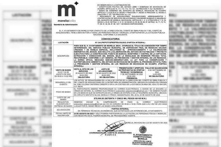 El Ayuntamiento de Morelia, convoca a personas fiscas y morales a participar en la licitación pública nacional para otorgar el título de concesión por tiempo determinado, del servicio público municipal, de disposición final de residuos sólidos urbanos y de manejo especial. Las bases incluyen el aprovechamiento y la valorización energética del biogás, la elaboración del estudio de factibilidad y proyecto ejecutivo para la construcciÃ...