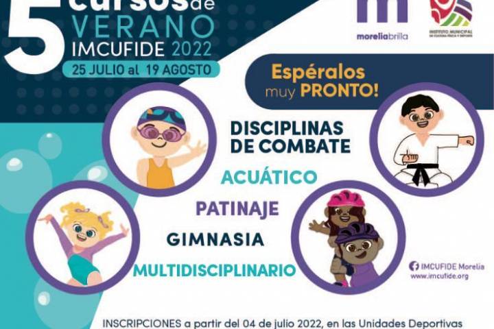 NOTICIAS 03/07/2022Lanza IMCUFIDE convocatoria para Cursos de Verano 2022Con la intención de brindar una alternativa para que las niñas y niños morelianos se activen y adquieran nuevas habilidades durante su periodo vacacional, así como para evitar el sedentarismo y la obesidad infantil, el Ayuntamiento de Morelia, a través del Instituto Municipal de Cultura Física y Deporte (IMCUFIDE), lanzó la convocatoria para sus Cursos de Verano 2022.