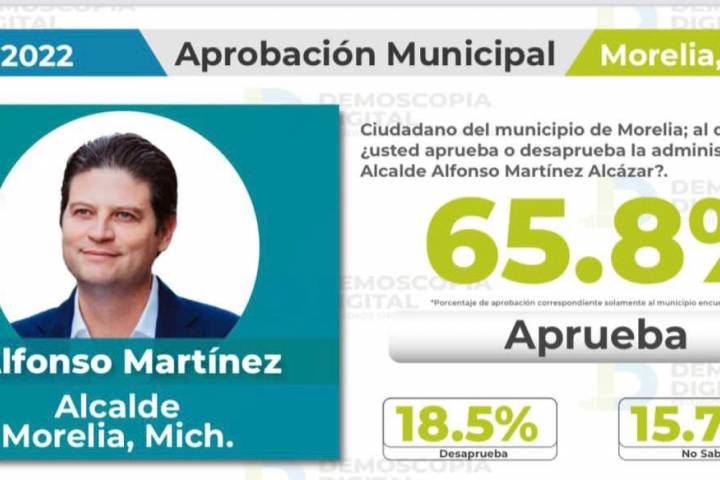 NOTICIAS 04/07/2022Los resultados en encuestas son buenos, pero trabajaremos el doble: Alfonso Martínez Con una aprobación del 65.8%, el presidente de Morelia, Alfonso Martínez Alcázar, se posicionó en el número 25 a nivel nacional, como uno de los alcaldes con mayor aceptación de la ciudadanía, esto de acuerdo a la encuestadora Demoscopia Digital.