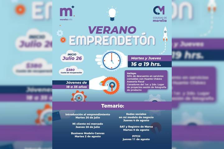 NOTICIAS 06/07/2022En puerta, Verano Emprendetón en el Colegio de MoreliaEl próximo 26 de julio arranca el Verano Emprendetón en el Colegio de Morelia, un taller que está dirigido a las y los jóvenes de 18 a 35 años que quieren iniciar en el mundo del emprendimiento.
