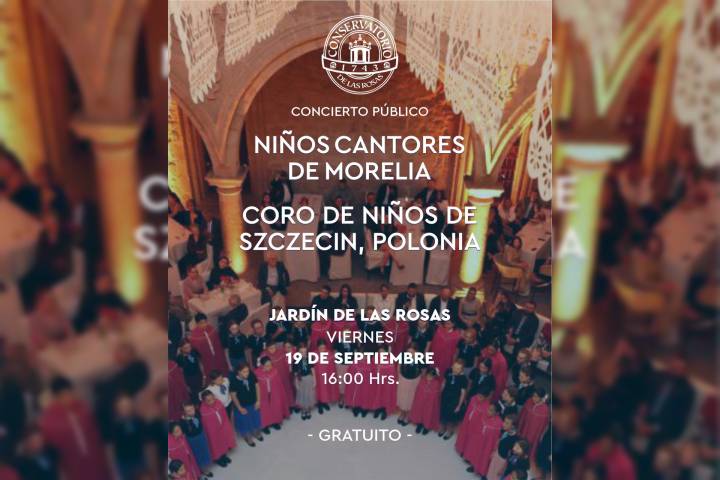 NOTICIAS 19/09/2025Niños Cantores de Morelia y Coro Infantil de Polonia darán concierto público gratuitoEl DIF Morelia encabezado por la presidenta honoraria, Paola Delgadillo Hernández, invita a las familias y a toda la ciudadanÃa a disfrutar este viernes de un concierto público gratuito en el JardÃn de las Rosas: a partir de las 16:00 horas, el público podrá deleitarse con la presentación del Coro de Niños de Szczecin, Polonia, y de los Niños Cantores de Morelia, dos agrupaciones de excelencia que unen tradición, talento y esperanza en ... Ver más...