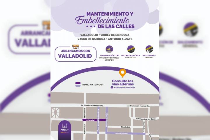 NOTICIAS 26/07/2018Ayuntamiento realizará mantenimiento y embellecimiento de calle Valladolid Cumpliendo con la encomienda del Presidente Municipal de Morelia, Alfonso Martínez Alcázar, de continuar con la transformación y mejoramiento de las vialidades del municipio, en próximos días arrancará la obra de mantenimiento y embellecimiento de la calle Valladolid, en el Centro Histórico de la ciudad.