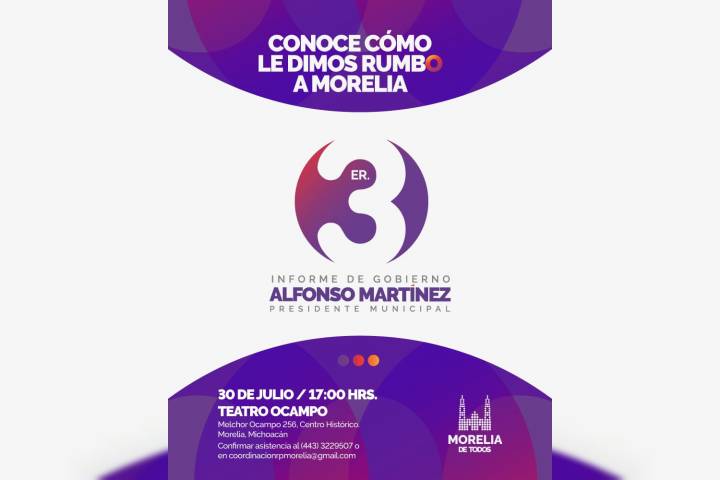 NOTICIAS 27/07/2018Alfonso Martínez, realizará 3er Informe de Gobierno este lunes Este lunes 31 de julio en punto de las 17:00 horas y teniendo como sede el Teatro Ocampo de esta Ciudad Capital, el Presidente Municipal de Morelia, Alfonso Martínez Alcázar, realizará su tercer Informe de Gobierno, para dar cuenta a la ciudadanía de las acciones emprendidas por la Administración Independiente para el beneficio de la población.