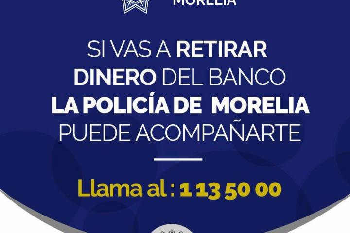 NOTICIAS 28/07/2018Continúa abierto y al servicio de la ciudadanía, Acompañamiento Bancario de la Policía de MoreliaBajo la finalidad de brindarle protección a la ciudadanía capitalina en todo momento, la Policía de Morelia invita a todas las personas usuarias de servicios bancarios interesadas en este servicio, a solicitar el programa de "Acompañamiento Bancario", el cual es completamente gratuito.