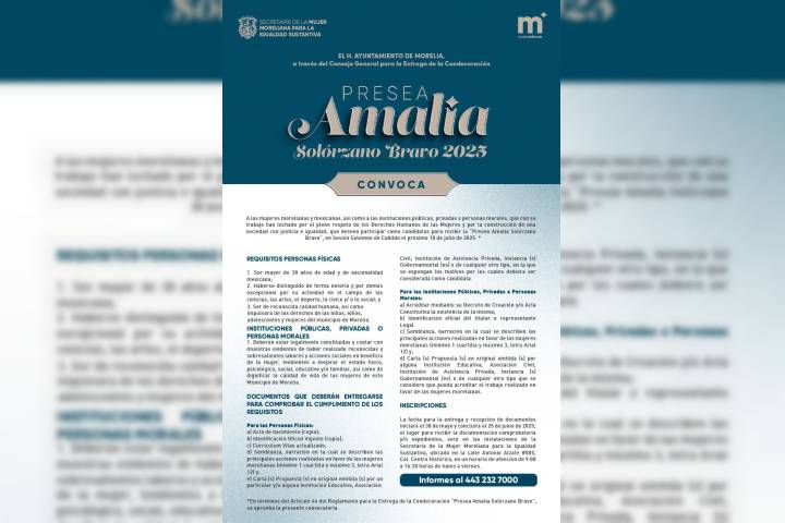 El Gobierno de Morelia, a través de su SecretarÃa de la Mujer Moreliana para la Igualdad Sustantiva (Semmujeris), recuerda a la ciudadanÃa que está por cerrar la convocatoria para recibir postulaciones a la Presea "Amalia Solórzano Bravo" 2025, que reconoce el trabajo de mujeres e instituciones que han contribuido a la defensa de los derechos de las mujeres y la construcción de una sociedad más justa e igualitaria.