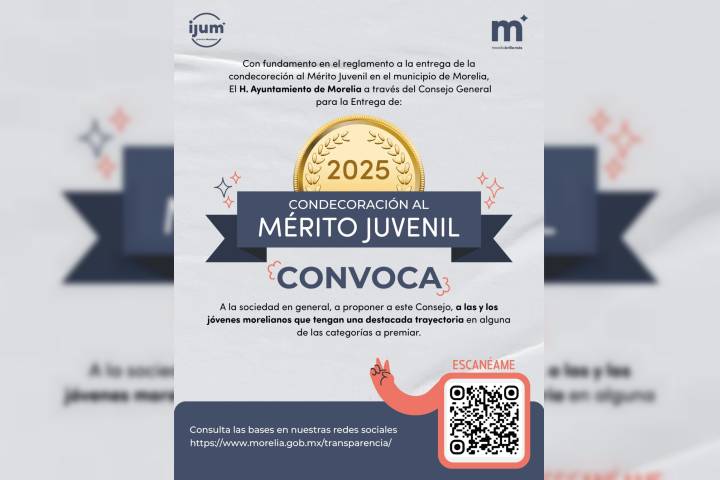 NOTICIAS 03/05/2025Gobierno de Morelia premiará a jóvenes destacados Consciente de que la juventud es una pieza fundamental para el desarrollo y futuro de Morelia, el Gobierno Municipal, encabezado por el Presidente Alfonso Martínez Alcázar, refrenda su compromiso con este sector, a través del Instituto de la Juventud Moreliana (IJUM), recordando que está por concluir la convocatoria para participar en la Condecoración al Mérito Juvenil 2025.