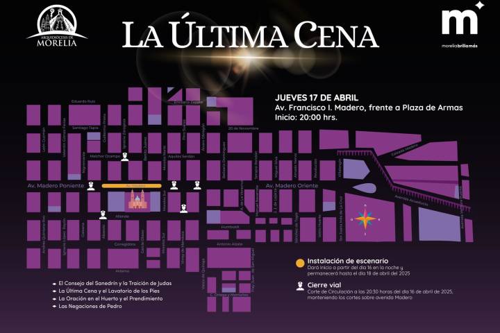 NOTICIAS 11/04/2025Impulsa Gobierno de Morelia primera presentación de La Última Cena frente a Catedral La esperada escenificación en vivo de La Última Cena tendrá lugar frente a la Catedral de Morelia el próximo 17 de abril a las 20:00 horas, como parte de las representaciones de Semana Santa que por primera vez tendrán lugar sobre la avenida Madero, impulsadas en la administración del presidente Alfonso MartÃnez Alcázar.