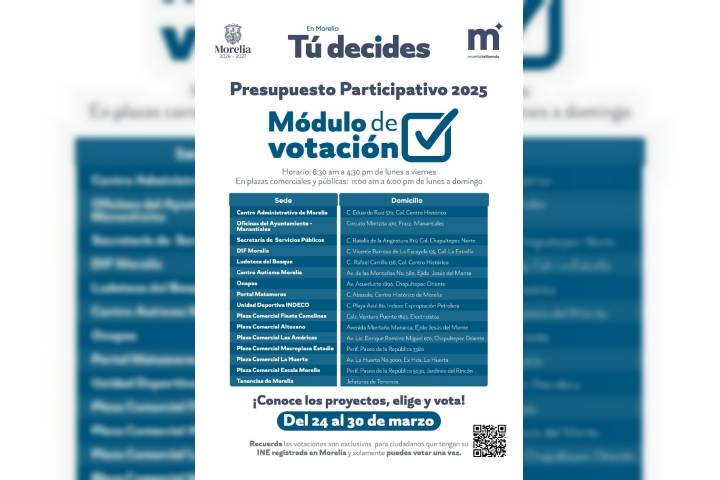 NOTICIAS 30/03/2025Hoy, último dÃa para votar proyectos que integrarán el Presupuesto Participativo 2025. Este domingo es el último dÃa para que las y los morelianos participen en la votación de los proyectos que integrarán el Presupuesto Participativo 2025, y de esta forma colaborar activamente en las decisiones que beneficiarán a la ciudad y sus habitantes.