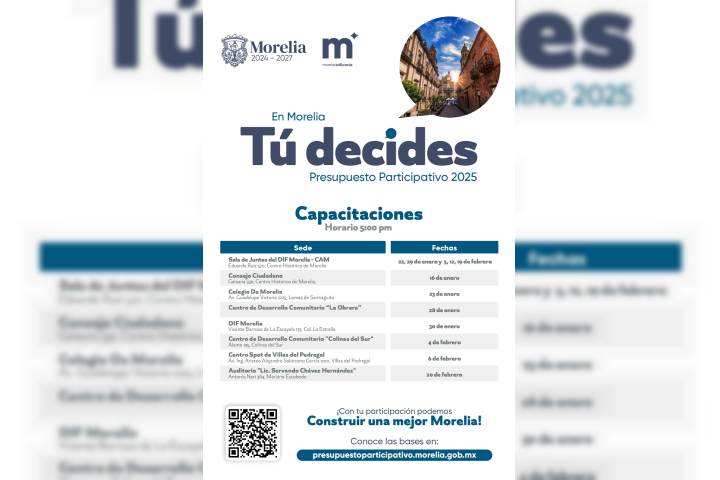 NOTICIAS 16/01/2025Gobierno de Morelia invita a capacitaciones del Presupuesto Participativo 2025Con el objetivo de seguir recibiendo una gran e informada participación de parte de la ciudadanÃa, el Gobierno del Presidente Municipal de Morelia, Alfonso MartÃnez Alcázar, invita a morelianas y morelianos a formar parte de las capacitaciones del Presupuesto Participativo 2025.