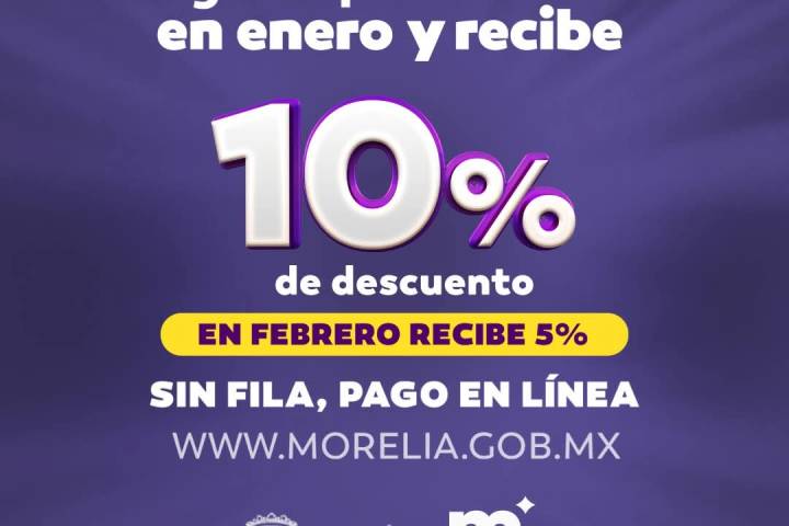 NOTICIAS 09/01/2025Continúa Gobierno de Morelia con el 10 por ciento de descuento en el pago del Predial Con el fin de apoyar el pago puntual de los ciudadanos, el Gobierno de Morelia informa que sigue vigente y aún se puede aprovechar el 10 por ciento de descuento en la contribución municipal del Predial 2025, el cual se ofrece en casi una veintena de módulos disponibles tanto en la zona urbana como la rural.