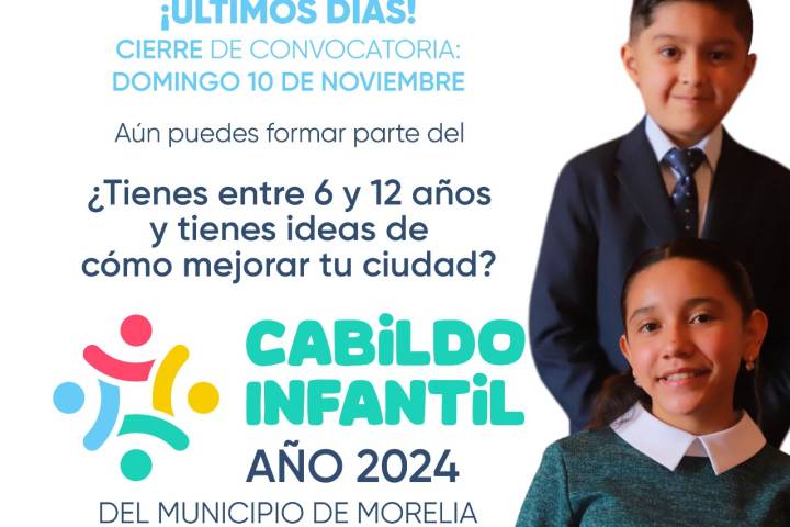NOTICIAS 08/11/2024Últimos días para que niñas y niños participen en Cabildo Infantil 2024 de DIF MoreliaEl DIF Morelia, que encabeza la Presidenta Honoraria, Paola Delgadillo Hernández, recuerda a las familias morelianas que la convocatoria para el Cabildo Infantil 2024 estará abierta hasta el próximo domingo 10 de noviembre; esta iniciativa permite que niñas y niños de entre 6 y 12 años compartan sus propuestas para mejorar su ciudad y se involucren en la vida cívica desde una edad temprana.