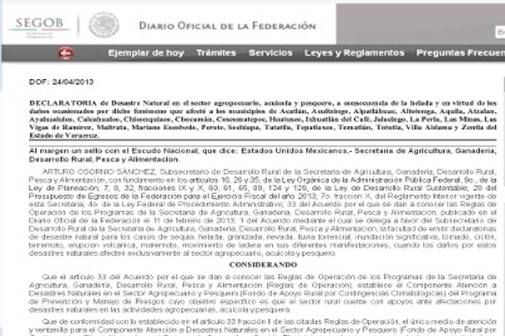 La Secretaría de Agricultura, Ganadería, Desarrollo Rural, Pesca y Alimentación (Sagarpa) dio a conocer las declaratorias de desastre natural en los sectores agropecuario, acuícola y pesquero de varios municipios de Michoacán y de Veracruz.