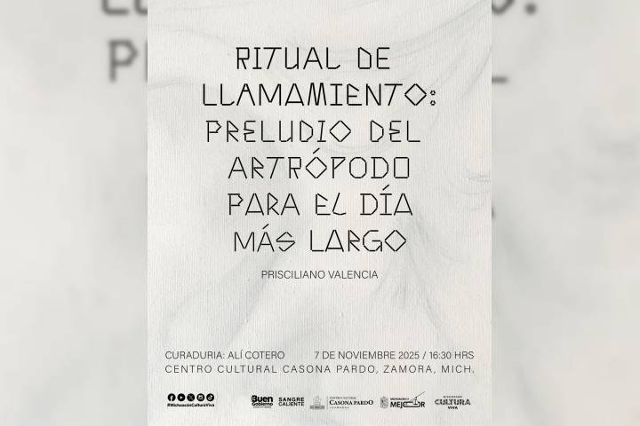 NOTICIAS 08/11/2025Secum lleva a Zamora expo "Ritual de Llamamiento" del michoacano Prisciliano ValenciaLa Secretaría de Cultura de Michoacán (Secum) presentará la exposición "Ritual de llamamiento: preludio del artrópodo para el día más largo", del artista michoacano Prisciliano Valencia, este viernes 7 de noviembre a las 16:30 horas en el Centro Cultural Casona Pardo, en Zamora, con entrada libre.