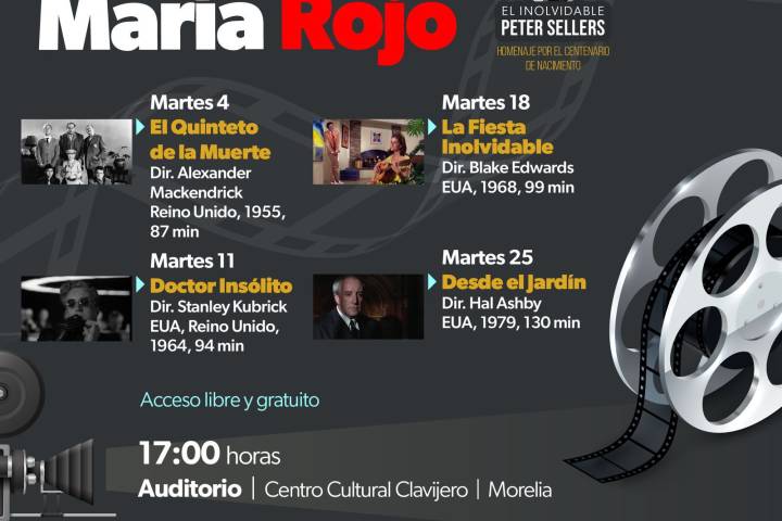 NOTICIAS 11/11/2025Videoteca María Rojo rinde homenaje al genio cómico Peter Sellers en Clavijero: SecumEn el marco del centenario del nacimiento del actor y comediante británico Peter Sellers, la Videoteca María Rojo de la Biblioteca Pública Central Francisco J. Múgica, en colaboración con la Secretaría de Cultura de Michoacán (Secum), presenta un ciclo de cine dedicado a celebrar su legado, con proyecciones todos los martes de noviembre en el Auditorio del Centro Cultural Clavijero, a las 17:00 horas.