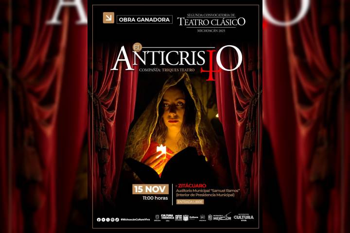 NOTICIAS 13/11/2025Secum presentará obra "El Anticristo" en ZitácuaroLa Secretaría de Cultura de Michoacán (Secum) invita a la presentación de "El Anticristo", puesta en escena de Triques Teatro, ganadora de la segunda edición de la convocatoria Teatro Clásico Michoacán 2025. La función se llevará a cabo el 15 de noviembre a las 11:00 horas, en el Auditorio Municipal "Samuel Ramos", dentro de la Presidencia Municipal de Zitácuaro, con entrada libre.