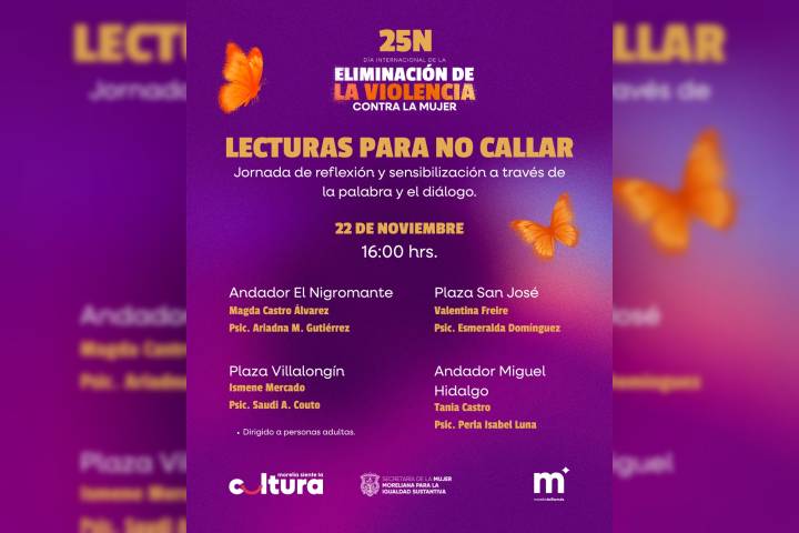 NOTICIAS 19/11/2025SeCultura Morelia invita a jornada de lectura y diálogo en el marco del 25NLa Secretaría de Cultura de Morelia (SeCultura) invita a la ciudadanía a participar en las "Lecturas para no callar", una jornada simultánea de reflexión y sensibilización a través de la palabra y el diálogo en el marco del 25 de noviembre (25N), Día Internacional de la Eliminación de la Violencia contra la Mujer.