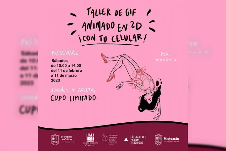 NOTICIAS 31/01/2023Aprende GIF Animado desde tu celular, en el Centro Cultural Clavijero La Secretaría de Cultura de Michoacán (Secum), a través de Centro Cultural Clavijero (CCC), abre el taller "GIF Animado en 2D con tu Celular" para personas jóvenes y adultas interesadas en el dibujo, la animación y la ilustración, a realizarse los sábados del 11 de febrero al 11 de marzo del presente año.
