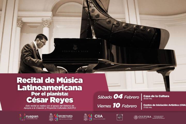 NOTICIAS 03/02/2023El pianista César Reyes ofrecerá dos recitales de música latinoamericana El pianista César Reyes llegará a Uruapan para ofrecer dos recitales de música latinoamericana el próximo sábado 4 y viernes 10 de febrero, a las 18:00 y 17:00 horas, en la Casa de la Cultura y el Centro Integral de Iniciación Artística, respectivamente, gracias a las gestiones del Gobierno Municipal.