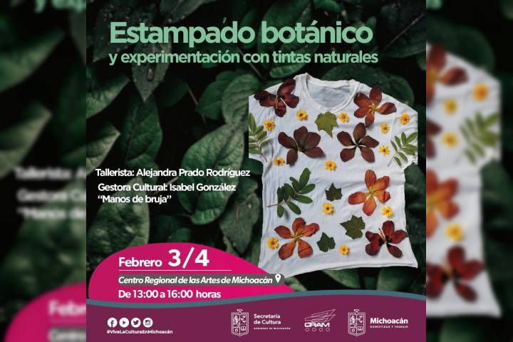 NOTICIAS 24/01/2023Realizará Secum taller de "Estampado botánico" en el CRAMLa extracción de tintes de plantas, flores y vegetales para la creación de piezas con colores y patrones únicos se podrá experimentar en el taller "Estampado botánico" que la Secretaría de Cultura de Michoacán (Secum) llevará a cabo el 3 y 4 de febrero en las instalaciones del Centro Regional de las Artes de Michoacán (CRAM) en Zamora.