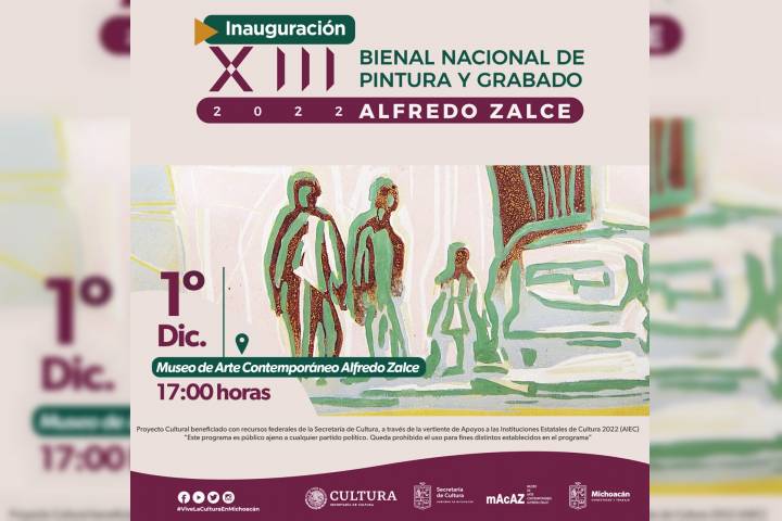 NOTICIAS 24/11/2022Por montaje de la XIII Bienal Nacional de Pintura y Grabado "Alfredo Zalce", el MACAZ cerrará sus puertasEl Museo de Arte Contemporáneo "Alfredo Zalce" (MACAZ) se mantendrá cerrado a partir de este dÃa y hasta el primero de diciembre, tiempo en el que se inaugurará la XIII Bienal Nacional de Pintura y Grabado "Alfredo Zalce", realizada a través de la SecretarÃa de Cultura Federal, en coordinación con la SecretarÃa de Cultura de Michoacán (Secum), mediante los proyectos de Apoyos a las Instituciones Estatales de Cultura 2022.