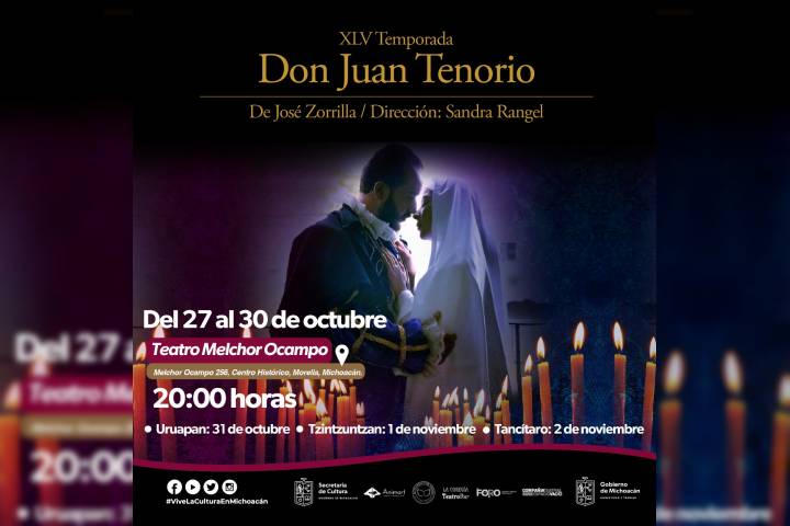 NOTICIAS 30/10/2022Llega la XLV temporada de Don Juan Tenorio a UruapanLa Secretaría de Cultura de Michoacán (Secum), en coordinación con los colectivos de teatro Animart Video, La Coregía y Espacio Vacío, bajo la dirección de Sandra Rangel García, presentarán el 31 de octubre la obra "Don Juan Tenorio", en la Pérgola de Uruapan, a las 20:00 horas.