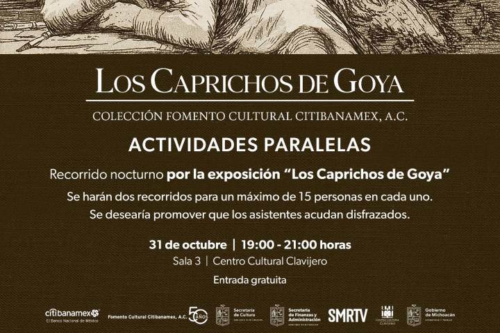 NOTICIAS 30/10/2022"Los Caprichos de Goya"Un conversatorio, un recorrido nocturno y una mesa redonda son las actividades paralelas que la Secretaría de Cultura de Michoacán (Secum), a través del Centro Cultural Clavijero (CCC), realizará en el marco de la exposición "Los Caprichos de Goya", del 31 de octubre al 4 de noviembre con acceso gratuito.
