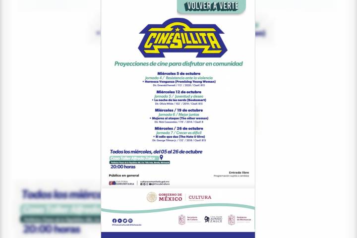 NOTICIAS 05/10/2022Casa Taller Alfredo Zalce, ofrece la programación de Cine Sillita de octubre El proyecto de la SecretarÃa de Cultura del Gobierno de México, a través de la Dirección General de Vinculación Cultural, Cine Sillita sigue presentando diversas cintas en dos ciclos, todos los miércoles de octubre, en la Casa Taller Alfredo Zalce, bajo la coordinación de la SecretarÃa de Cultura de Michoacán (SECUM) a través de su Departamento de Cine.
