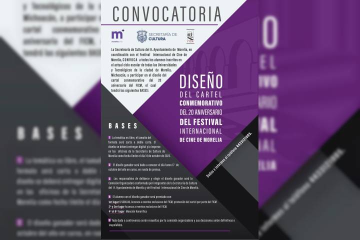 NOTICIAS 06/10/2022SeCultura y FICM amplÃan convocatoria para diseño de cartel conmemorativo La SecretarÃa de Cultura de Morelia en coordinación con el Festival Internacional de Cine de Morelia (FICM), amplÃan hasta el viernes 14 de octubre la convocatoria para recibir el diseño de cartel conmemorativo a los 20 años de promover del séptimo arte.