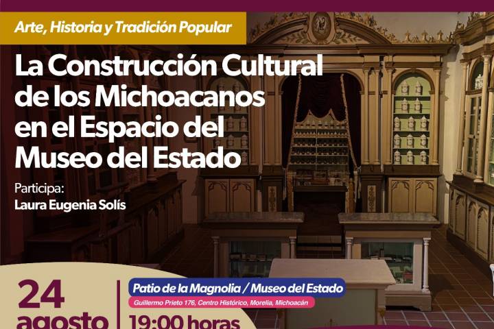 NOTICIAS 22/08/2022Invita Museo del Estado a conferencia magistral en el marco de su aniversarioContinúan los festejos del 36 aniversario del Museo del Estado de Michoacán (MEM), recinto que se encuentra bajo el resguardo de la Secretaría de Cultura de Michoacán (Secum). Dentro de su programa Arte, Historia y Tradición Popular, la historiadora Laura Eugenia Solís, ofrecerá la ponencia titulada "La construcción de los michoacanos en el espacio del Museo del Estado", este miércoles, 24 de agosto, a las 19:00 horas.