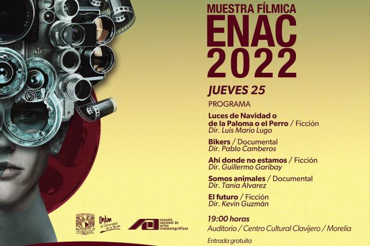 NOTICIAS 24/08/2022Finaliza Muestra Fílmica de la ENAC La Secretaría de Cultura de Michoacán (Secum) invita al cierre de la 25 edición de la Muestra Fílmica de la Escuela Nacional de Artes Cinematográficas (ENAC), el jueves 25 de agosto, a las 19:00 horas, en el auditorio del Centro Cultural Clavijero (CCC).