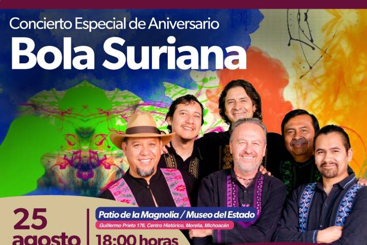 NOTICIAS 24/08/2022Museo del Estado recibe a Bola SurianaComo parte de las actividades para celebrar su aniversario número 36, el Museo del Estado de Michoacán (MEM) ofrecerá un concierto con el grupo Bola Suriana, el 25 de agosto a las 18:00 horas, con acceso gratuito.