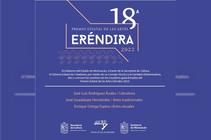 NOTICIAS 26/08/2022Secum da a conocer los resultados del 18° Premio Estatal de las Artes Eréndira El Gobierno de Michoacán, a través de la Secretaría de Cultura de la entidad (Secum), da a conocer los resultados del 18° Premio Estatal de las Artes Eréndira (PEAE) 2022.