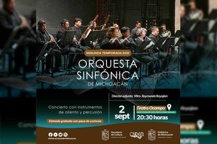 NOTICIAS 28/08/2022Ofrecerá OSIDEM concierto para alientos y percusiónContinúa la segunda temporada de conciertos la Orquesta Sinfónica de Michoacán (OSIDEM), que en esta ocasión se presentará con un programa especial para alientos y percusión, el 2 de septiembre a las 20:30 horas, en el Teatro Ocampo.