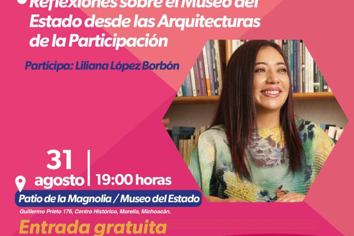 NOTICIAS 29/08/2022Museo del Estado invita a charla de Liliana López Borbón "Reflexiones sobre el Museo del Estado desde las arquitecturas de la participación" es el nombre de la charla que impartirá Liliana López Borbón, especialista en Construcción de Ciudadanía y Políticas Culturales, el 31 de agosto a las 19:00 horas, en el Museo del Estado de Michoacán (MEM), como cierre a su programación del 36 aniversario y en el marco de los "Miércoles de Arte, Historia y Tradición Popular".