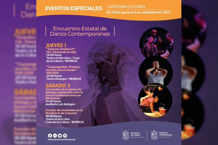 NOTICIAS 26/08/2022Inicia Encuentro Estatal de Danza Contemporánea 2022La Secretaría de Cultura de Michoacán (Secum) invita al Encuentro Estatal de Danza Contemporánea (EEDC) 2022, a realizarse del 29 de agosto al 3 de septiembre, en el Centro Cultural Clavijero (CCC), Casa de la Cultura de Morelia y el Teatro Ocampo.