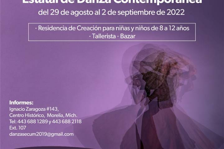 NOTICIAS 02/07/2022Secum convoca al Encuentro de Danza Contemporánea 2022 La Secretaría de Cultura del Estado de Michoacán (Secum) convoca a grupos, compañías y creadores locales a participar en su proceso de selección para integrar la programación del Encuentro Estatal de Danza Contemporánea (EEDC) a desarrollarse el 29 de agosto al 2 de septiembre de 2022 en Morelia.
