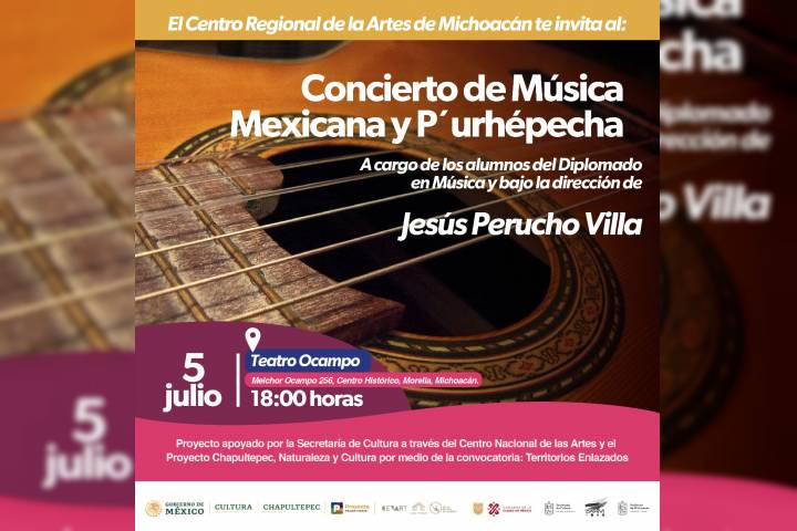 NOTICIAS 04/07/2022Muestran resultados del Diplomado de Música con concierto orquestal en el Teatro OcampoLa Secretaría de Cultura en Michoacán (Secum) invita al próximo concierto de los alumnos del Diplomado en Música de Zamora, a desarrollarse el martes 5 de julio a las 18:00 horas en el Teatro Ocampo de la capital michoacana, bajo la dirección musical de Jesús Perucho Villa.