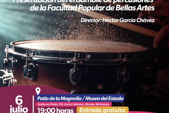 NOTICIAS 05/07/2022Se presentará el Ensamble de Percusiones de la FPBA en el Museo del EstadoEl Ensamble de Percusiones de la Facultad Popular de Bellas Artes (FPBA) ofrecerá una presentación el 6 de julio a las 19:00 horas en el Museo del Estado de Michoacán (MEM), como parte del programa Arte, Historia y Tradición Popular.