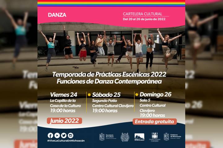 NOTICIAS 23/06/2022SECUM Y FPBA presentan Temporada de Prácticas Escénicas 2022: Funciones de Danza Contemporánea La licenciatura en Danza de la Facultad Popular de Bellas Artes (FPBA) de la Universidad Michoacana de San Nicolás de Hidalgo (UMSNH), a través de la Secretaría de Cultura de Michoacán (SECUM), presenta la Temporada de Prácticas Escénicas 2022: Funciones de Danza Contemporánea, que inicia el viernes, 24 de junio, con entrada gratuita.
