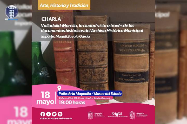 NOTICIAS 18/05/2022Museo del Estado conmemora aniversario de Morelia con la conferencia "Valladolid-MoreliaLa Secretaría de Cultura de Michoacán (SECUM), a través del Museo del Estado (MEM), y dentro del programa Arte, Historia y Tradición, conmemora el 481 aniversario de Morelia con la charla "Valladolid-Morelia, la ciudad vista a través de los documentos históricos del Archivo Histórico Municipal", impartida por la maestra Magali Zavala García, este día, en el patio de la Magnolia, a las 19:00 horas.