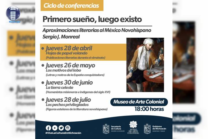NOTICIAS 27/04/2022Inicia ciclo de conferencias "Primero Sueño, luego existo"La Secretaría de Cultura del Estado de Michoacán (SECUM), a través del Museo de Arte Colonial (MACOL), invita al ciclo de charlas "Primero Sueño, luego existo (aproximaciones literarias al México novohispano)", que será impartido por el escritor Sergio J. Monreal el jueves último de cada mes, durante los próximos cuatro meses.