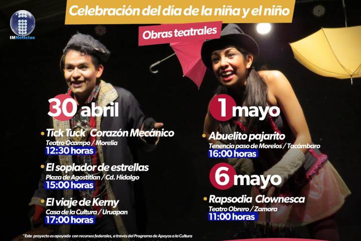 NOTICIAS 28/04/2022Con funciones gratuitas de teatro en 5 municipios, SECUM celebra el Día del NiñoPara festejar a la población infantil y apoyar su formación integral, en el marco de la celebración del Día del Niño, entre el 30 de abril y el 6 de mayo, la Secretaría de Cultura de Michoacán (SECUM), a través de su Departamento de Teatro, invita a la población a disfrutar diferentes montajes escénicos, que se ofrecerán en 5 municipios de la entidad.