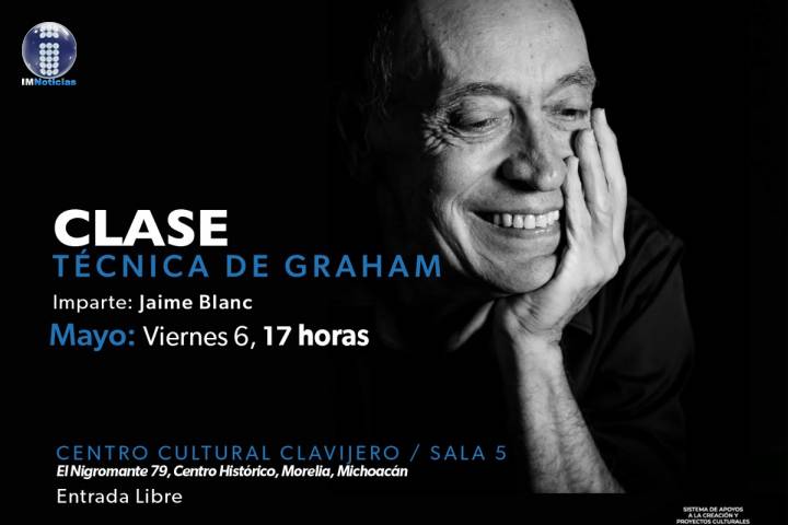 NOTICIAS 03/05/2022Jaime Blanc impartirá Clase Magistral de Técnica de Graham en el Centro Cultural ClavijeroEstudiantes de nivel intermedio de danza, tendrán la posibilidad de asistir a la Clase Magistral Técnica de Graham organizada por la Secretaría de Cultura de Michoacán (SECUM), impartida por el coreógrafo, bailarín y docente-investigador mexicano Jaime Blanc, el 6 de mayo en la Sala 5 del Centro Cultural Clavijero, a las 17:00 horas.