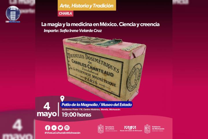 NOTICIAS 03/05/2022El Museo del Estado presenta la charla "La Magia y la Medicina en México. Ciencia y Creencia" A través del programa Arte, Historia y Tradición, que cada miércoles desarrolla el Museo del Estado de Michoacán (MEM), se presenta este 4 de mayo la charla "La magia y la medicina en México. Ciencia y creencias", impartido por la investigadora en arte Sofía Irene Velarde Cruz, a las 19:00 horas, en el Patio de La Magnolia.