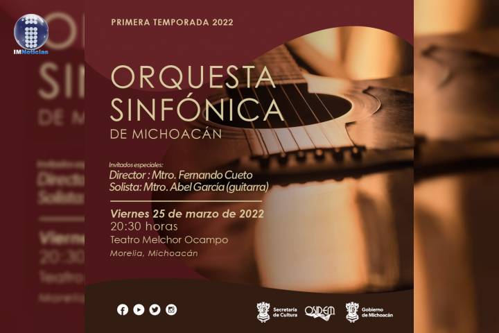 NOTICIAS 21/03/2022El guitarrista Abel García dará concierto acompañado de la OSIDEM, bajo la dirección de Fernando CuetoPara continuar con la primera temporada de conciertos 2022, la Orquesta Sinfónica de Michoacán (OSIDEM) presenta este viernes 25 de marzo, a las 20:30 horas, en el Teatro Ocampo, al solista y guitarrista Abel García, bajo la batuta del director invitado Fernando Cueto.