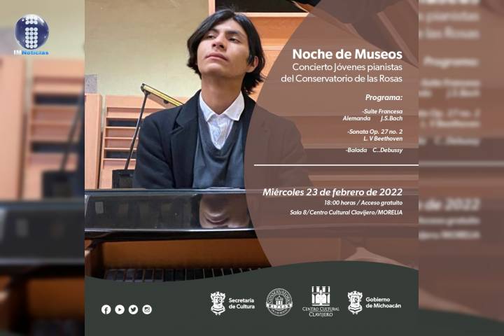 NOTICIAS 21/02/2022Inicia la temporada Noches de Museos en el Centro Cultural ClavijeroLa Secretaría de Cultura del Estado, a través de la Dirección de Producción Artística y Desarrollo Cultural, en colaboración con el Conservatorio de las Rosas, presentan la temporada Noche de Museos, la cual dará inicio, este miércoles 23 de febrero, a las 18:00 horas, en la Sala 8, del Centro Cultural Clavijero (CCC), con la participación del joven pianista, Miguel Ángel Taxilaga Magaña.